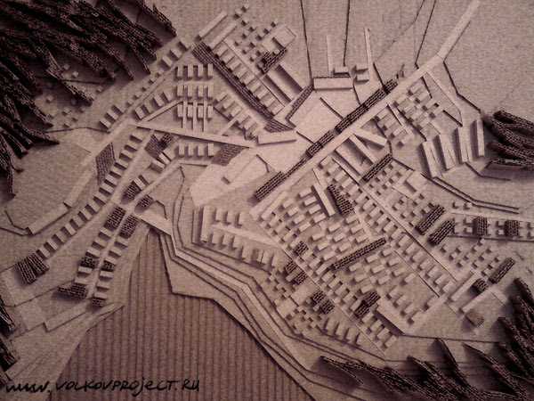 Перебирая архивные фотографии наткнулся на свой студенческий проект 1995 года. Посёлок на 1000 жителей. В основе пространственной организации территории лежит использование существующего условного рельефа местности, который не только не сглаживается, но и подчёркивается подпорными стенами.